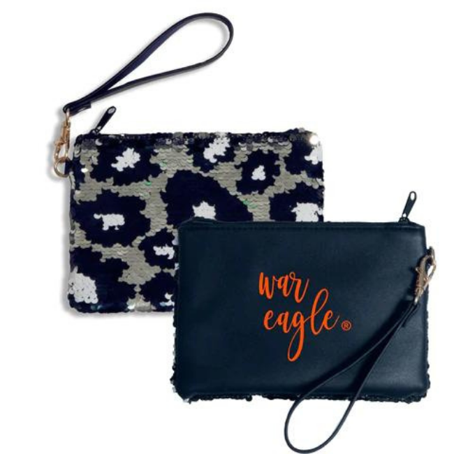 Stadium and Fashion approved reversible sequined wristlet. Reversible sequins are even more fun in your team colors! Features include size -  6.5"w x 4.5"h, vegan leather back, zipper closure, and removable wristlet strap.