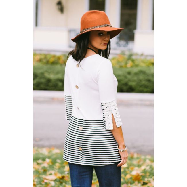 Show your spirit in our "Home is Where" Button-Lace Top featuring stripes, crochet lace trim, wooden buttons, plus glitter and matte print embellishment.