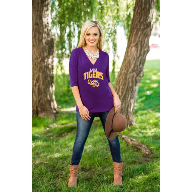 Classic logo v-neck with 3/4 length sleeves, in your primary team color proudly displays your SCHOOL PRIDE!
