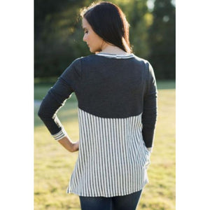 This adorable high-low logo tunic, which is trimmed in classic striped fabric matching neckline inset and cute half-back.