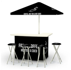 Our Bars, Umbrellas, and Stools can also be customized.