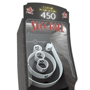The Skee-Ball Premium infuses seamlessly into your home decor, with the same high-quality craftsmanship and throwback aesthetics that characterize commercial machines, but scaled down to 80% of the size. Designed with a modern, sleek cabinet with a Merapi woodgrain finish, the Premium alley brings the classic arcade features you know and love right to your home with six different gameplays for up to 6 players.