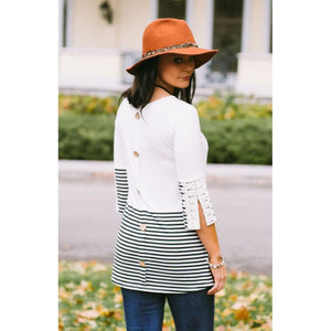 Show your spirit in our "Home is Where" Button-Lace Top featuring stripes, crochet lace trim, wooden buttons, plus glitter and matte print embellishment.