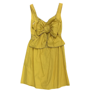 Can't get enough yellow? We've got just the dress for you! In orange and cream, this tieback dress is stunningly form fitting! One of our most flattering styles with a V style neckline, lightly padded bra, lined skirt, open top back with pre-tied/stitched bow covering the mid back, and featuring a back zipper. The waist of this dress is lined in three rows of pop out stitching and trimmed in matching ric rac! This dress is great as one of your favorite 'Gameday' looks!